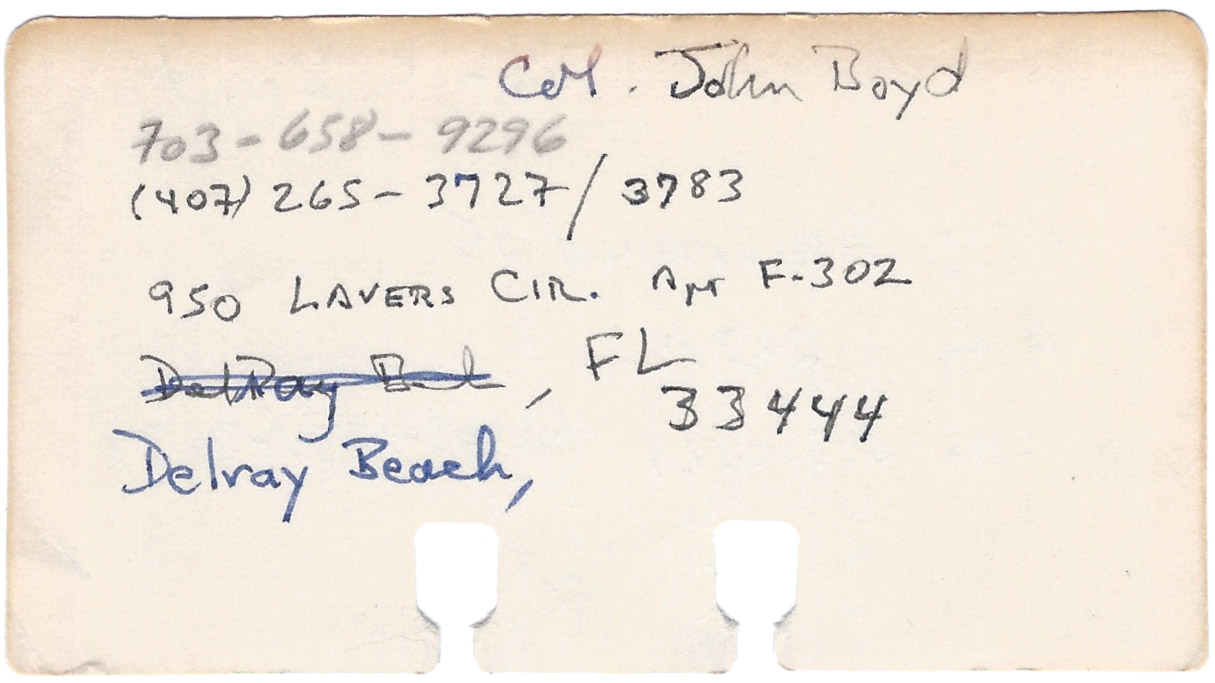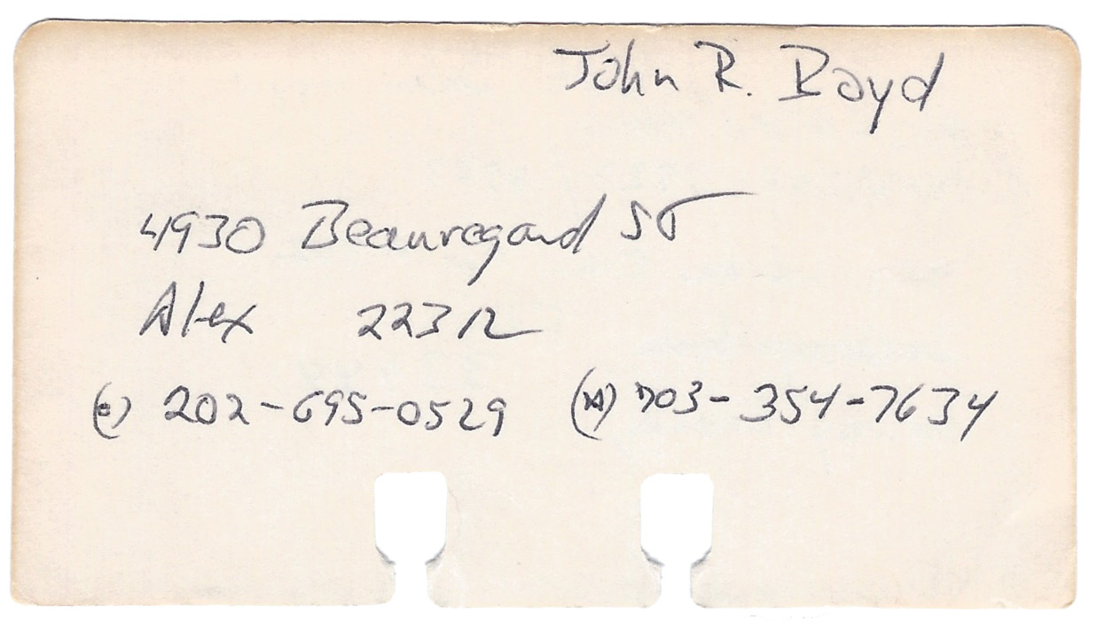 Boyd left Beauregard ST late in 1988. As best I recall, this card (called a “Rolodex card” for those of you under about 50) dates from around 1981, although it might be from as early as 1976. I believe that (202) 695-0529 was in the Tac Air shop, where Boyd worked as a consultant for Tom Christie after John’s retirement from the Air Force. A voice keeps insisting that my phone number, when I worked in the same office, was (202) 697-0521.